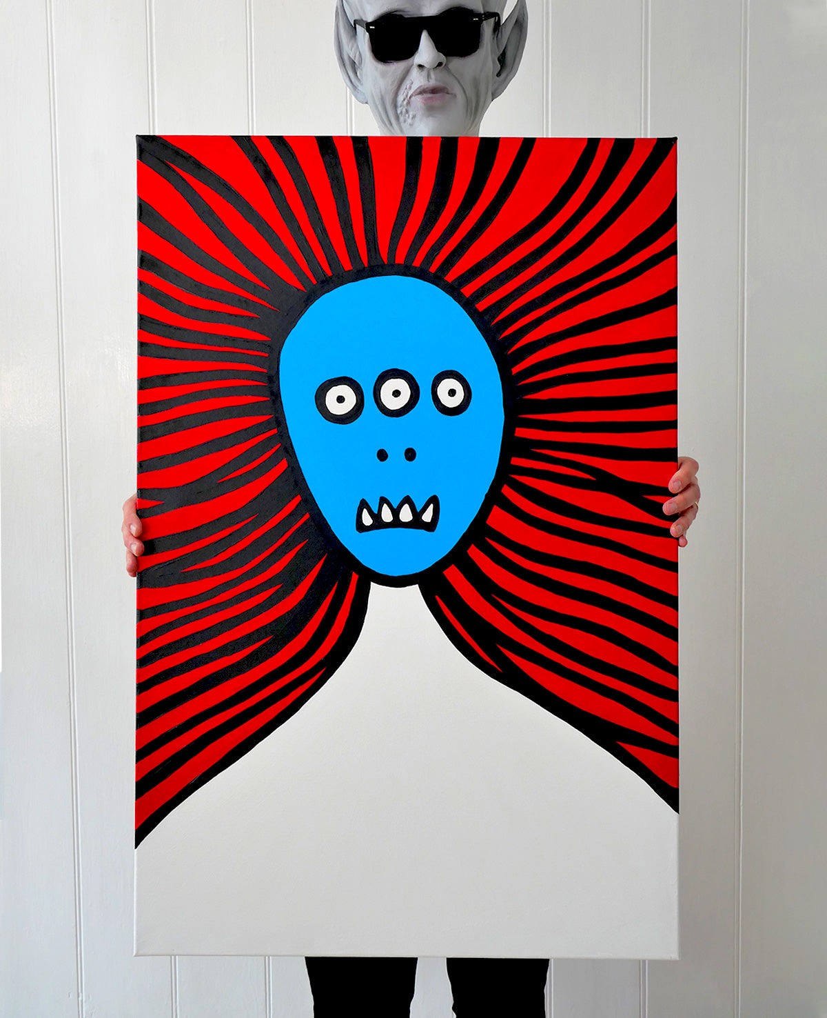 Painted in acrylic, these works blend bold graphic forms with block colours. Part sci-fi speculation, part social satire, every piece is one-of-a-kind — capturing moments of alien elegance, awkward assimilation, or quiet cosmic confidence.