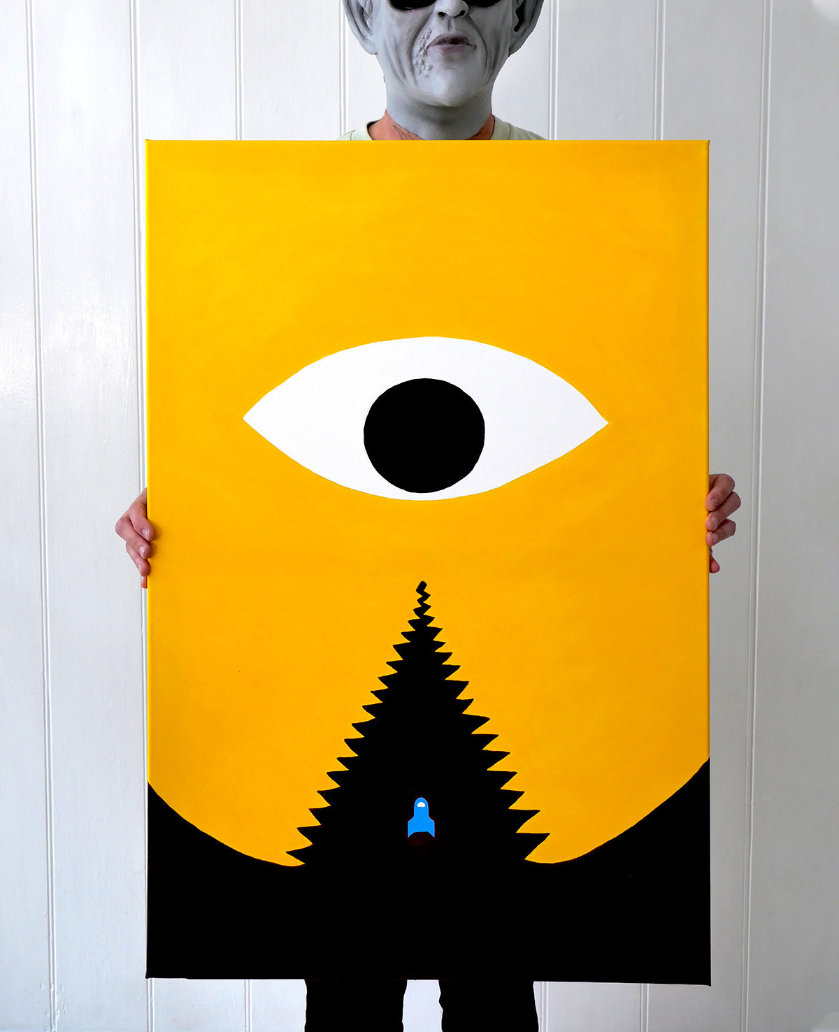 Painted in acrylic, these works blend bold graphic forms with block colours. Part sci-fi speculation, part social satire, every piece is one-of-a-kind — capturing moments of alien elegance, awkward assimilation, or quiet cosmic confidence.