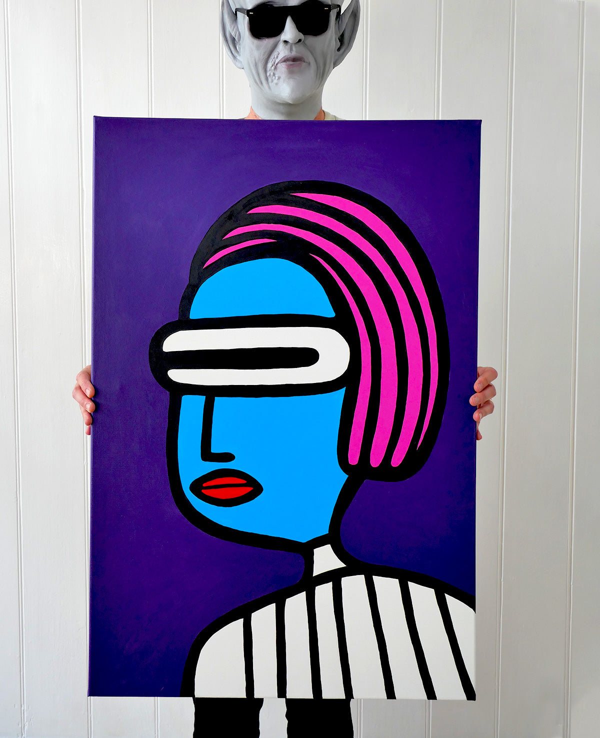 Painted in acrylic, these works blend bold graphic forms with block colours. Part sci-fi speculation, part social satire, every piece is one-of-a-kind — capturing moments of alien elegance, awkward assimilation, or quiet cosmic confidence.